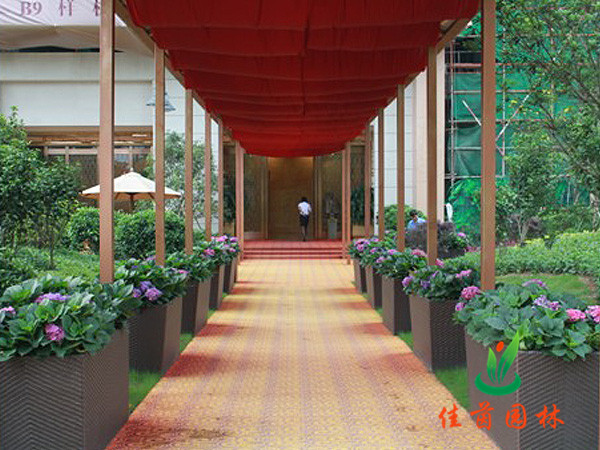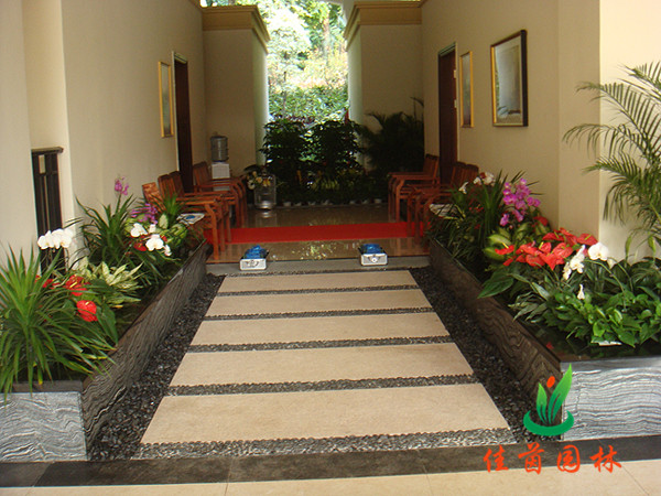 售楼中心主要包括大堂、销售通道以及样板房等,其室内绿化布置的主要功能是美化,但空气净化作用也很重要。由于售楼中心的顾客较多,所以多采用一些高大、空气净化作用强的植物,一般不选用那些枝叶较尖、较硬的植物,以免刺伤顾客,尤其是孩子和老人。在大堂、样板房、销售通道等重点位置布置精致的景点或组合盆栽效果较好,可选择的植物包括绿萝、口红花、富贵树、散尾葵、鱼尾葵、玉桂、吊兰、棕竹等。