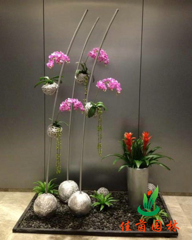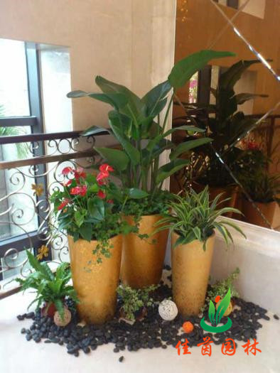 针对写字楼的这些基本特点,写字楼的植物布置,除了美化作用外,空气净化作用也很重要。现代写字楼主要由大堂和电梯厅、楼层组成,所以在植物布置设计时主要考虑对大堂、电梯厅进行绿植装饰(运用花艺与植物的艺术搭配,起到美化、分割、装饰空间的作用),对标准写字楼层(办公室)采用一些对空气净化作用大、抗辐射的植物,以起到净化室内空气、降低电脑等办公设备带来的辐射的作用,比如选择黄金葛、金琥、绿萝、发财树、富贵树等植物。另外由于空间的限制,办公室也可采用一些垂吊植物、组合景点增加绿化的层次感与空间感,可以采用绿萝、吊绿萝、巴西木、吊兰、荷兰铁、散尾葵、鱼尾葵、夏威夷椰子、发财树、棕竹等等。